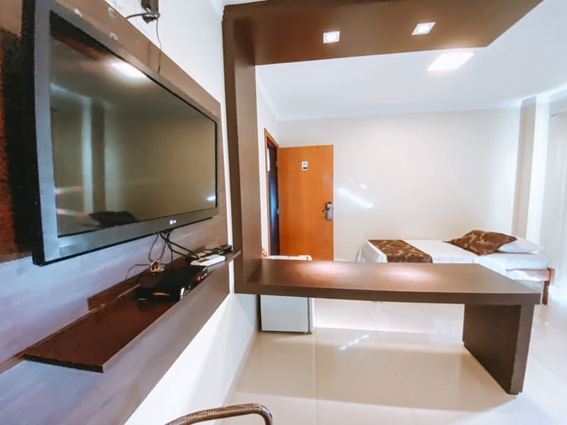 Apartamento de 35m² e equipado com uma cama king size SMART TV LED 42' (TV A CABO com mais de 50 canais disponíveis), guarda roupa, frigobar, ar condicionado split, internet wi fi cortesia, mesa de trabalho e banheiro com kit completo de amenidades.